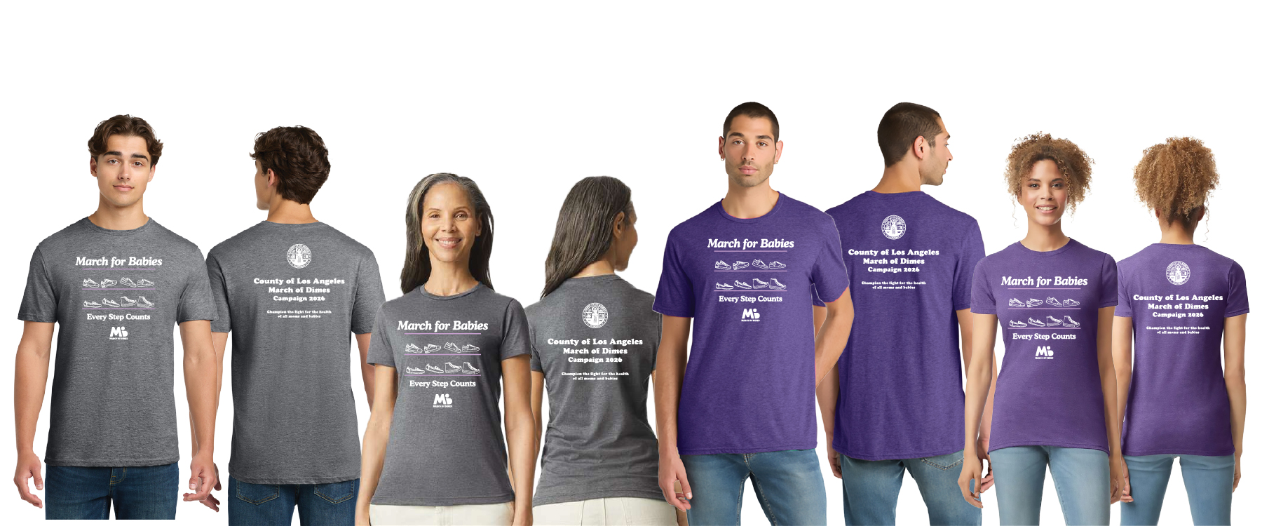 Welcome to the 2026 County of Los Angeles March for Babies Pop-Up Store benefiting the March of Dimes. Order your exclusive County of Los Angeles T-shirts in support of the 2026 March for Babies Walk. A portion of every purchase is donated directly to the March of Dimes to support moms and babies in our communities.